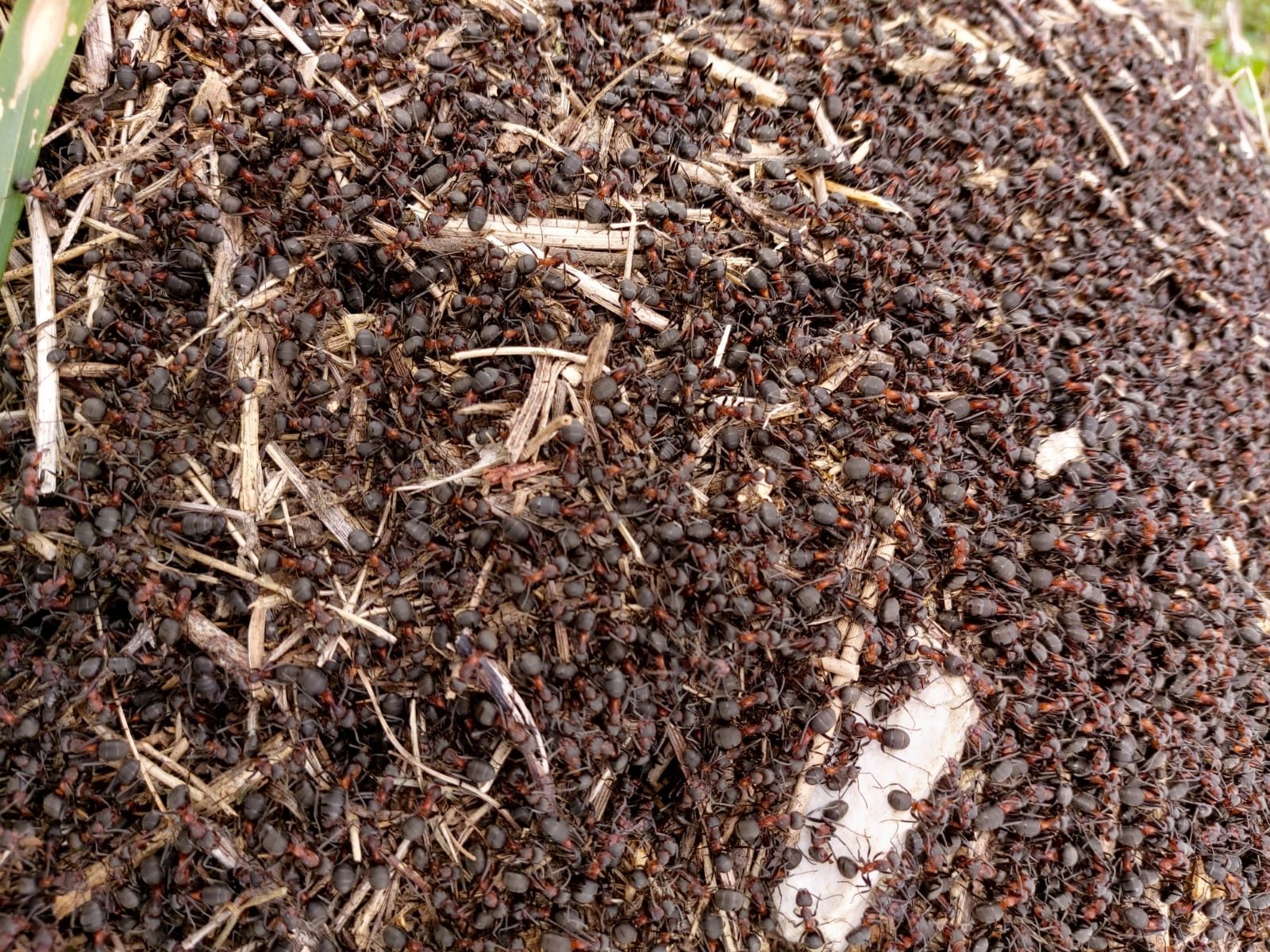 Es un hormiguero de grupo Formica rufa concretamente Formica pratensis. El comportamiento de este grupo es especialmente complejo.Calefactan los nidos tomando el sol y entrando para transportar el calor al interior, son especialistas en construcción ventilada y orientada a la regulación climática, para maximizar la exposición al calor, el lateral orientado al sur es el de mayor superficie….Dato que puede resultar muy practico si te lo encuentras por el bosque para orientarte. La geometría del diseño, permite a las obreras desplazar huevos, larvas y pupas a las cámaras con una temperatura optima. Podríamos decir que son un poco granjeras, pues propician temperatura y humedad para que se desarrollen hongos que forman parte de su dieta.